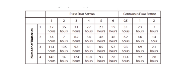 Typical battery duration on pulse setting 2, 20 breathsPerMinute