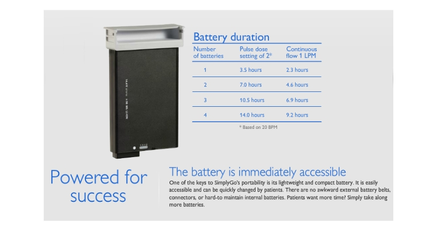 - 1 Battery: Pulse Dose setting (2) 222 minutes / 3.7 hours: Continuous Flow: (1) LPM 120 minutes / 2 hours: